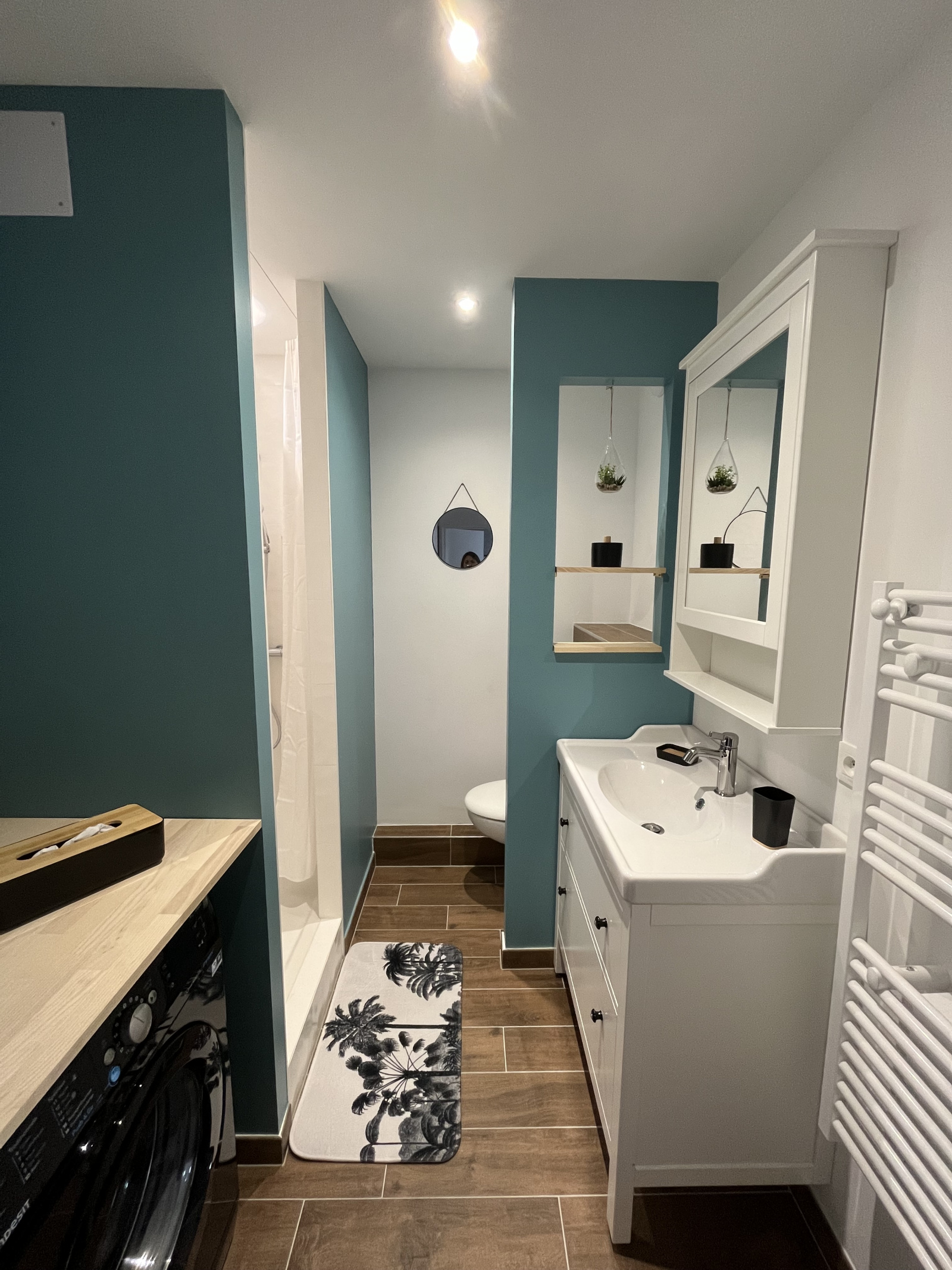 La salle d'eau a été totalement rénovée et dispose d'une douche, 1 WC, 1 meuble vasque et miroir, 1 sèche serviettes et 1 machine à laver (+ chauffe eau neuf).